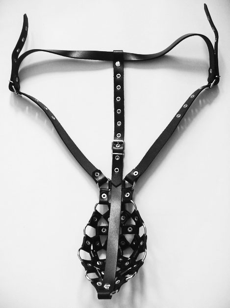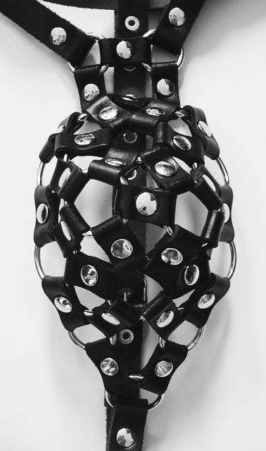 This fully loaded leather thong is crafted from genuine leather straps, precisely joined with metal studs to create a comfortable basket for your 'gems'. The waist strap is fully adjustable on the sides with buckles.